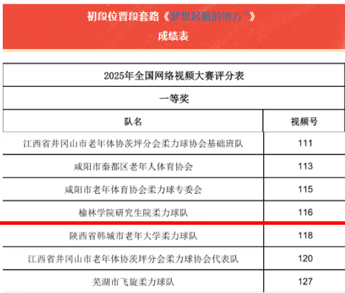 11月14日,2025年全民健身线上运动会全国柔力球网络视频大赛成绩正式揭晓,榆林学院柔力球队凭借初段位晋段套路《梦想起航的地方》的精彩表现,成功斩获一等奖、二等奖,用实力在全国舞台上彰显了我校学子的体育风采与团队魅力。